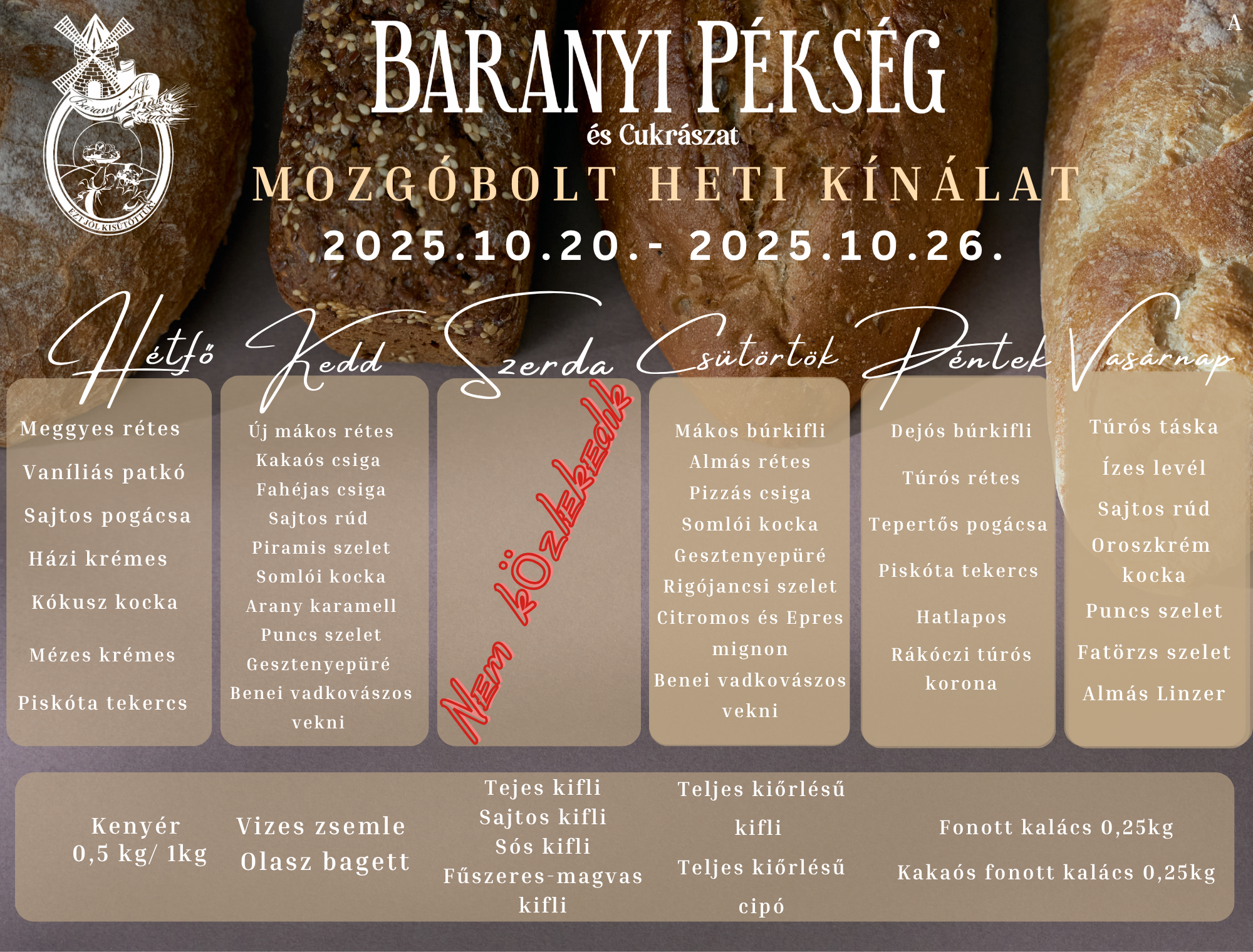 Hetente változó, napra leosztott kínálati táblázatunk, a délutáni mozgóbolt kiszállítás időszakára, ami 16:00 és 19:00 között esedékes.